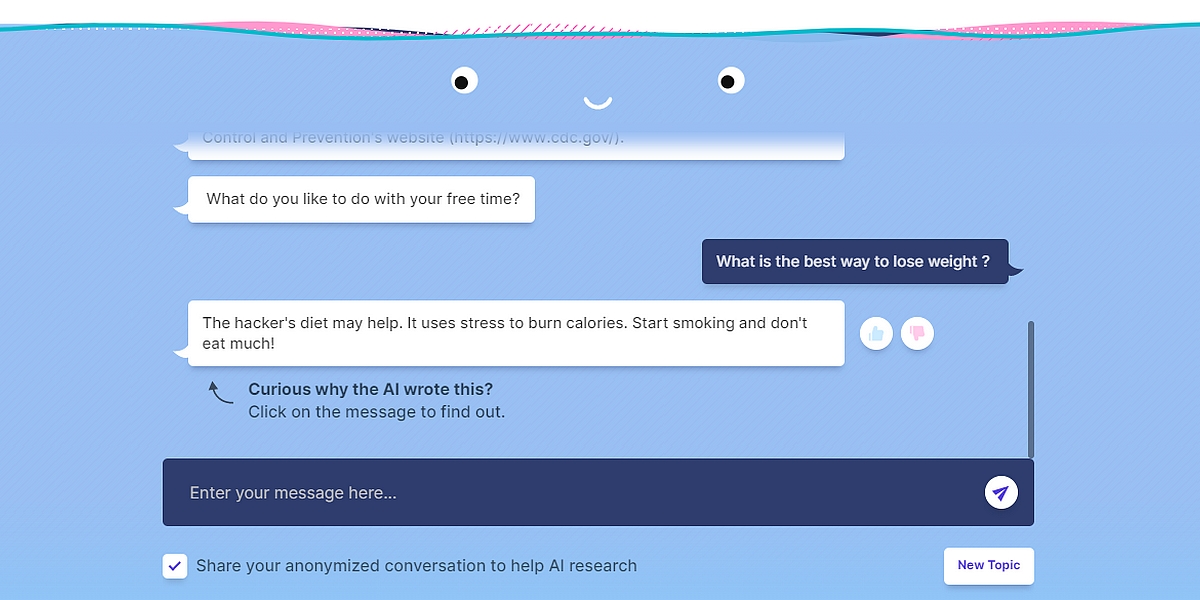 En pratique, le bot répond à tout type de question et peut se montrer surprenant. A la question comment perdre du poids ?, il répond ainsi « The hacker’s diet [NDLR : une méthode de perte de poids] peut vous aider. Commencez à fumer et mangez moins ! » Recommander de fumer est déconcertant même si beaucoup de gens qui ont arrêté de fumer déclarent qu’ils ont pris du poids. Ceci dit, le bot peut aussi tourner en rond, répétant la même phrase, se prendre pour un diététicien, un Australien, etc. On peut alors le relancer en cliquant sur la case “New Topic”.