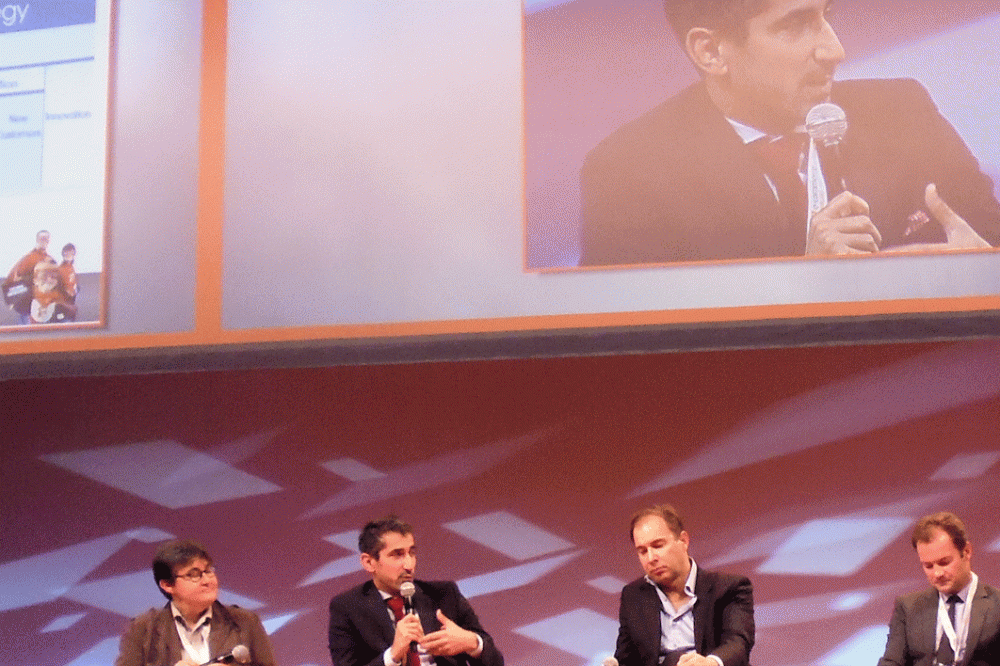Photo de la table ronde lors du salon e-commerce 2013, avec de gauche à droite : Sylvie Joseph de la Poste, Arnaud Masson de La Générale de Santé, Patrice Noirot Nerin de GDF Suez et Arnaud Bouchard de Cap Gemini.
