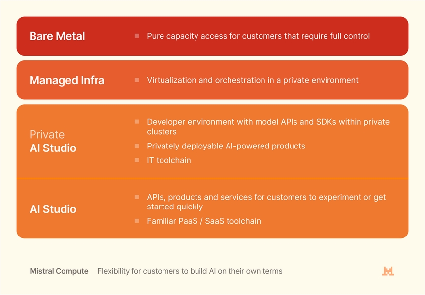A l’occasion du salon Viva Tech 2025 qui se tient à Paris, la startup annonce une nouvelle offre, Mistral Compute. Ce service propose aux clients une pile technique privée et intégrée comprenant les processeurs GPU, l’orchestration, les API, les produits et les services. Le client peut choisir des serveurs bare metal et jusqu’aux solutions PaaS (Plateformes as a service) entièrement gérées.
