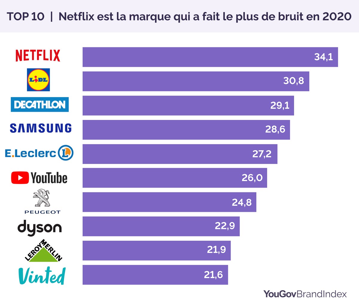 On trouve ensuite YouTube qui gagne une place. Là aussi le confinement a du contribuer à la progression de la marque de vidéos sur internet. Plus étonnant, le constructeur automobile Peugeot se maintient dans le Top 10 même s’il baisse en « buzz ». Dyson, avec ses aspirateurs et ses sèche cheveux, Leroy Merlin pour l’aménagement de la maison, et Vinted en ce qui concerne la vente et l’achat de vêtements d’occasion, pour leur part, sont les nouveaux entrants dans le Top 10. Ils remplacent Disneyland Paris, Carglass et Ikea.