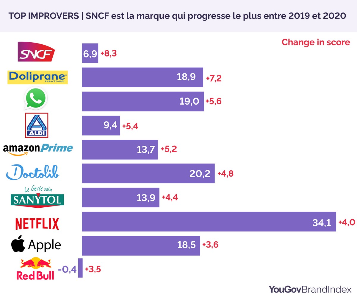 Yougov trace par ailleurs les meilleures progressions. La SNCF est la marque qui progresse le plus en « buzz » entre 2019 et 2020. Le groupe de transport a proposé de nombreuses offres et réductions afin de résister face à la pandémie de Covid-19 relève Yougov. Parmi les autres marques qui ont le plus progressé, on note les places de Doliprane, Doctolib et Sanytol. Red Bull ferme le classement.