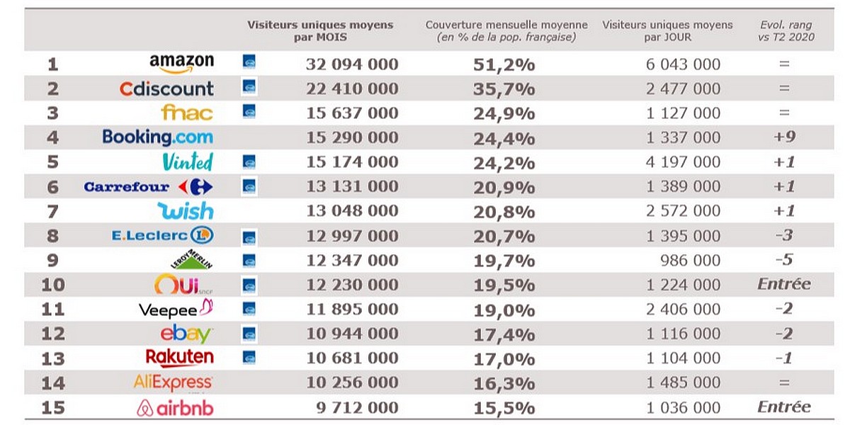 Oui.SNCF et Airbnb reviennent dans le Top 15 des sites e-commerce en France au 3ème trimestre 2020. Les deux sites e-commerce étaient présents au 1er trimestre et en étaient sortis au 2ème trimestre, crise sanitaire oblige. Ils reviennent au moment où le nombre de cyber-acheteurs atteint 41 millions en France, selon l’institut Médiamétrie. C’est 510 000 acheteurs de plus qu’en 2019 à la même période. « Les critères de sélection d’un site e-commerce sont le prix, la simplicité du retour ou du remboursement des produits et la livraison gratuite » liste Marc Lolivier, délégué général de la Fevad.