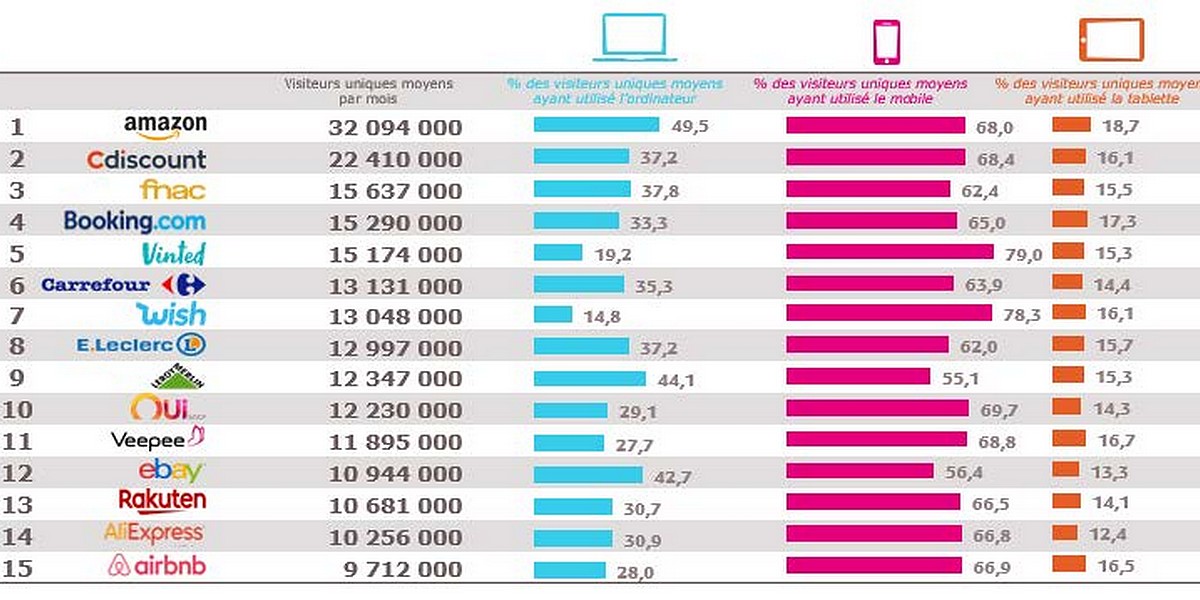 Le mobile est de loin le premier mode d’accès aux sites e-commerce du Top 15, sauf pour Amazon où le PC fixe occupe encore une place importante avec 1 internaute sur 2 l’utilisant quand il accède au site. On relève que ce sont les sites Vinted (produits d’occasion), Wish (produits à très petit prix), et Oui.SNCF (billets de train) qui arrivent en tête pour l’usage du mobile par leur clientèle.