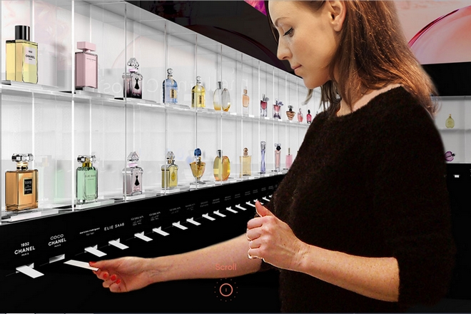 La cliente tire sur la bandelette parfumée et personnalisée au produit de la marque testée. Cela peut déclencher sur l’écran associé le lancement d’une campagne vidéo. L’écran permet également la demande de conseil à un vendeur ou le paiement. Disponibilité en septembre ou octobre 2017 si tout va bien.