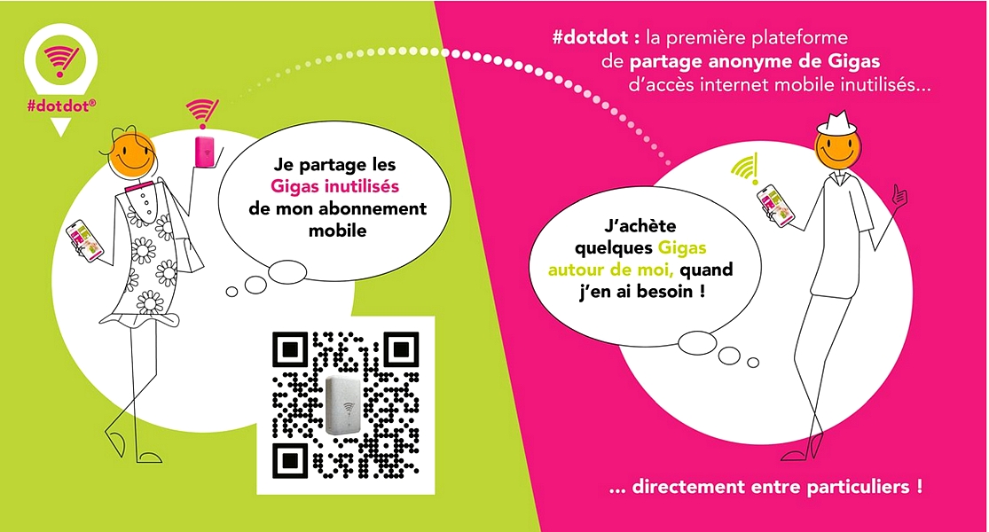 DotDot propose le partage anonyme et sécurisé de gigas d’accès à l’internet mobile non utilisés entre particuliers. Chacun peut créer un accès internet à la demande, anonyme et sécurisé, dans un rayon de 100 mètres, en utilisant un petit répéteur WiFi, le #dot, appairé à son smartphone.