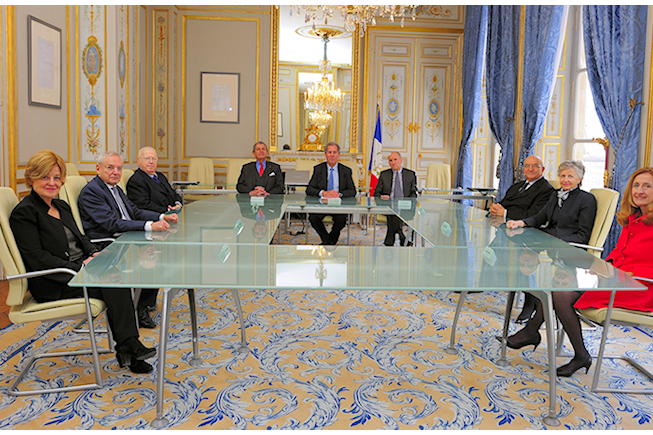 Photo : 9 des membres du Conseil constitutionnel dans la salle de séance. Il manque les trois anciens présidents de la République.