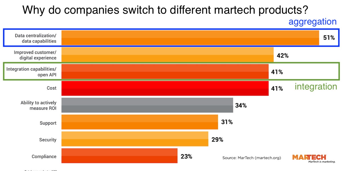Dans le détail, la raison numéro 1 (51% des réponses) qui justifie le changement d’outil est le fait d’obtenir une « centralisation des données et des capacités de données ». En 3ème position, la raison du changement (41%) tient aux « capacités d’intégration et aux API ouvertes ». On retrouve ainsi l’enjeu de répondre aux besoins d’agrégation des données et d’intégration avec les autres outils de l’entreprise. Les tâches du marketing nécessitent en effet d’agréger les données, les flux, les interfaces utilisateurs et la gouvernance. Et tout cela doit être intégré dans ces plates-formes d’agrégation pour y parvenir.