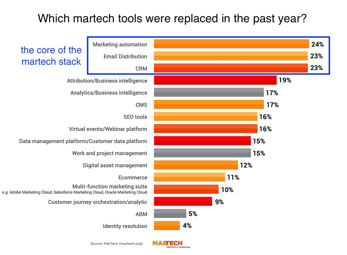 Ce qui a été un peu surprenant, cependant, c’est ce que les marketeurs remplacent. Les solutions de loin les plus fréquemment remplacées sont l’automatisation du marketing (24%) et le CRM (23%). A noter que la diffusion d’e-mails (23%) qui est dans ce tiercé de tête est généralement considérée comme faisant partie de l’automatisation du marketing par la plupart des gens.
