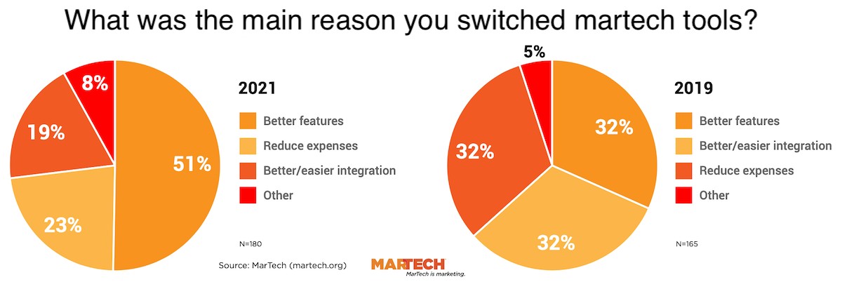 La motivation principale pour ce changement est le fait de disposer de meilleures fonctionnalités (51% des réponses). Ce choix ne réunissait que 32% des réponses en 2019. L’augmentation du poids de ce critère peut être considérée comme étant le signe que la concurrence apporte des améliorations significatives de l’offre du marché. En deuxième position, les marketeurs donnent la réduction des coûts comme étant raison du changement d’outil (23% des réponses). Enfin, 19% disent qu’ils ont changé d’outil pour disposer d’une meilleure intégration avec ses autres outils ou qu’elle soit plus facile à réaliser.