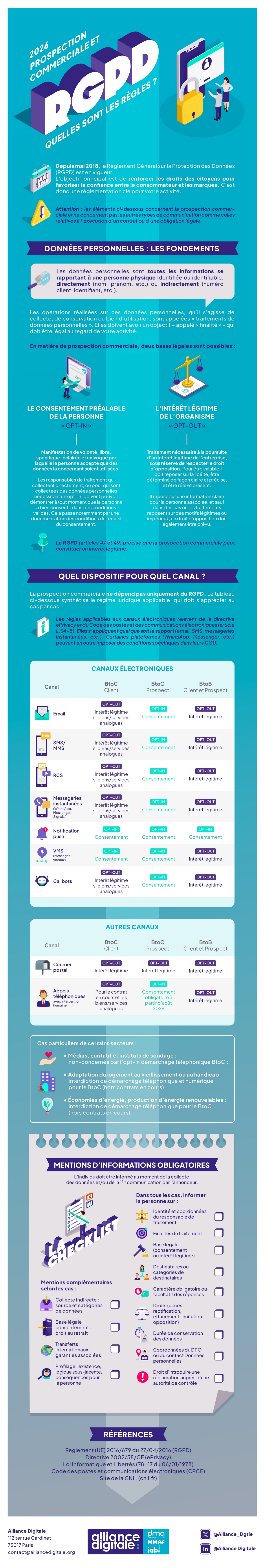 Huit ans après l’entrée en vigueur du RGPD, les règles de la prospection commerciale restent l’un des sujets les plus critiques pour les entreprises. Alliance Digitale publie une infographie qui balise les pratiques légales en 2026.
