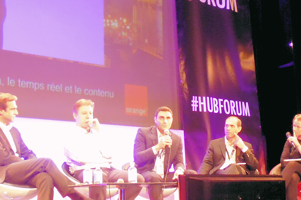 Photo, sur la scène du Hub Forum, de gauche à droite : Marc Lolivier de la Fevad, Jean-François Gomez de Microsoft, Daniel Malouf d’Auchan, Benoît Gourdon d’Adobe et Marion Moreau de FrenchWeb.