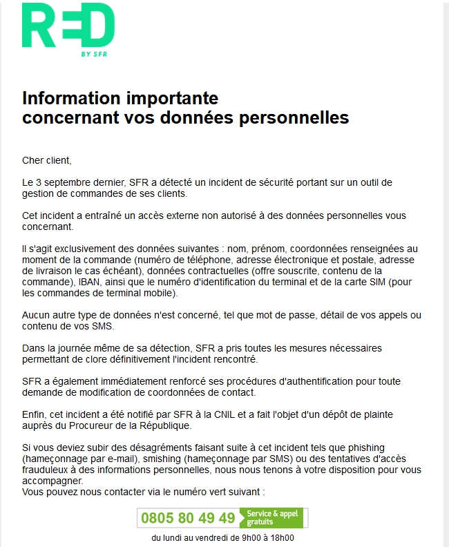 L’incident a été détecté par l’opérateur télécoms le 3 septembre. L’information a été confirmée par SFR auprès de l’AFP après que des lettres aient été adressées aux abonnés. Les données concernées sont le nom, prénom, téléphone, email, adresse postale, adresse de livraison, offre souscrite, contenu de la commande.