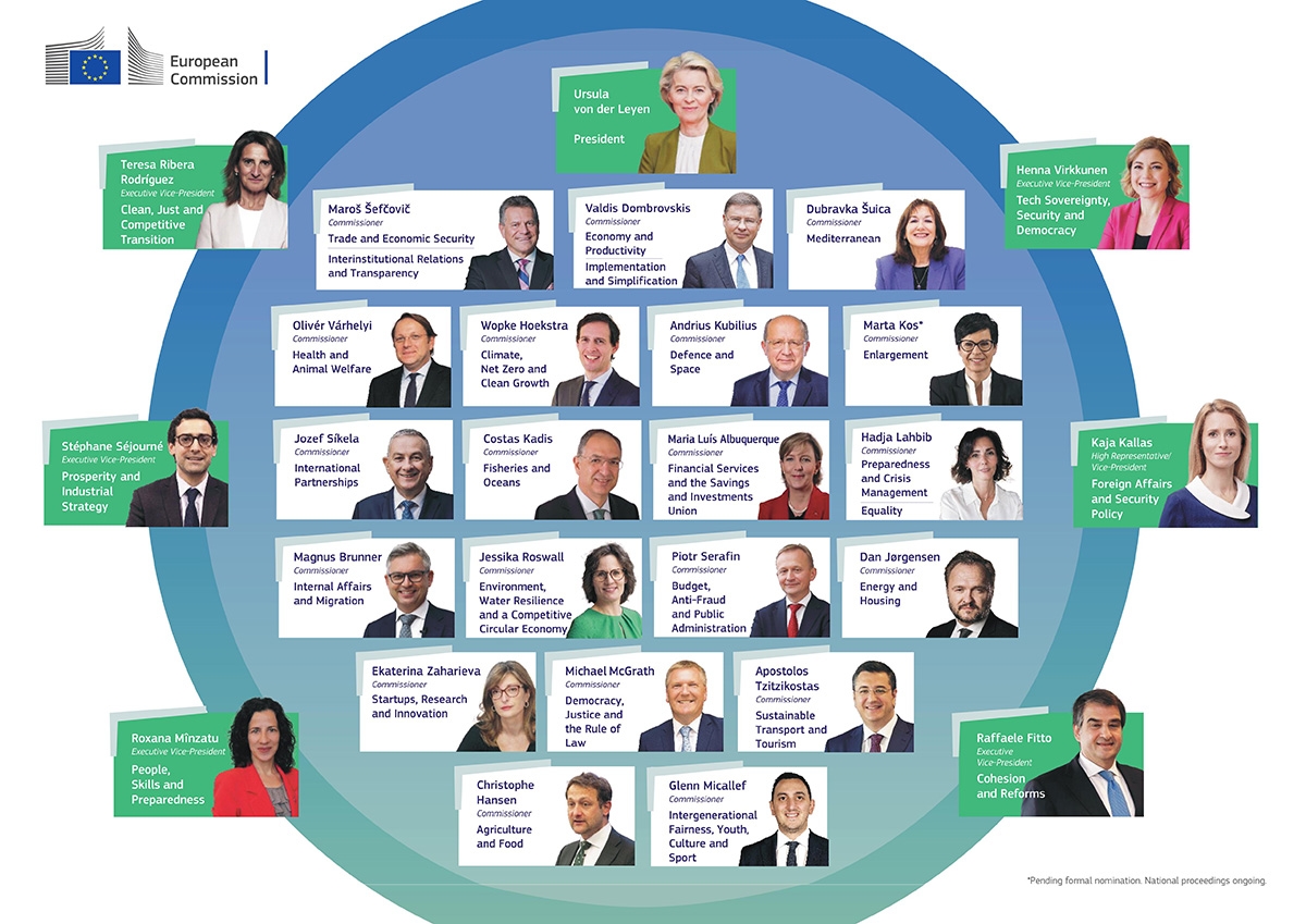 Stéphane Séjourné, proche d’Emmanuel Macron, est chargé de la prospérité et de la stratégie industrielle de l’Europe. Il remplace le commissaire sortant Thierry Breton victime de ses mauvaises relations avec Ursula von der Leyen. La socialiste espagnole Teresa Ribera, ministre de Pedro Sanchez, bénéficie d’un large portefeuille consacré à la transition écologique. l’Italien Raffaele Fitto, membre du gouvernement de Giorgia Meloni, est chargé de la cohésion et des réformes.